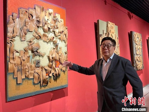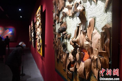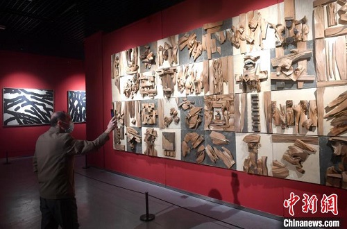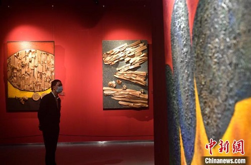 記者在現場看到,周瑛畫作有原木材質的裝置藝術,有“石”塊印記的版畫,以及自然題材的油畫作品;有形跡可辨的具象,也有抽象的意象。李豫閩告訴記者,畫家創作所用的木料是產自臺灣的檜木,或來源于彼時臺灣大拆寺廟時的木材——有的作品中釘子洞眼清晰可辨。