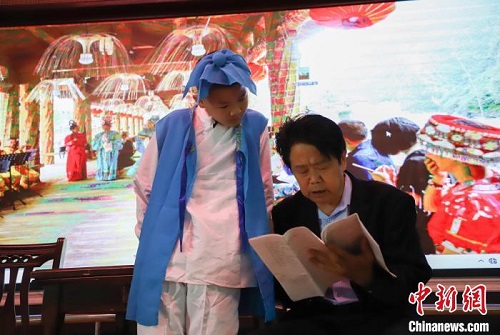 曹祖兵(右)對鄧力歌的唱腔進行指導 譚元敏 攝