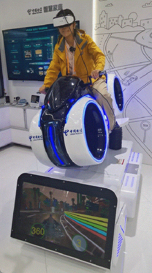 在博覽會現場,小新還騎上了炫酷的5G+VR摩托車,體驗“飆車”的感覺:只要你戴上VR眼鏡,啟動設備,就會進入虛擬賽道,享受到騎著摩托車飛奔的感覺,甚至還會體驗到起步、急停的眩暈感。