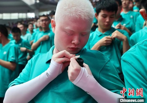 8月15日,清華大學舉行2024級本科生新生開學典禮。來自山東省菏澤市的本科新生張藝瑄正在佩戴?;?。中新社記者 易海菲 攝