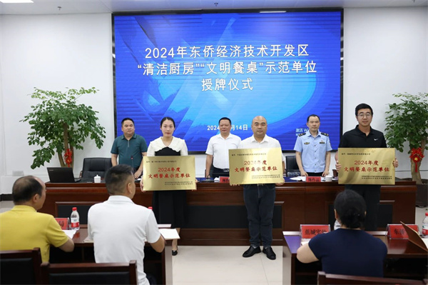 東僑網消息(吳夏冰)6月14日下午,東僑召開2024年上半年食品安全形勢分析會,會議通報2023年食安委成員單位食品安全工作考評情況;宣讀創建“清潔廚房”示范單位和“文明餐桌”示范點驗收情況;并舉行“清潔廚房”示范單位及“文明餐桌”示范點授牌儀式,對2024年上半年食品安全形勢分析及下半年工作進行再部署、再推進。開發區黨工委委員、政法委書記、管委會副主任、食安委副主任林作勇出席會議并講話。開發區有關部門、企業和社區負責人參加會議。